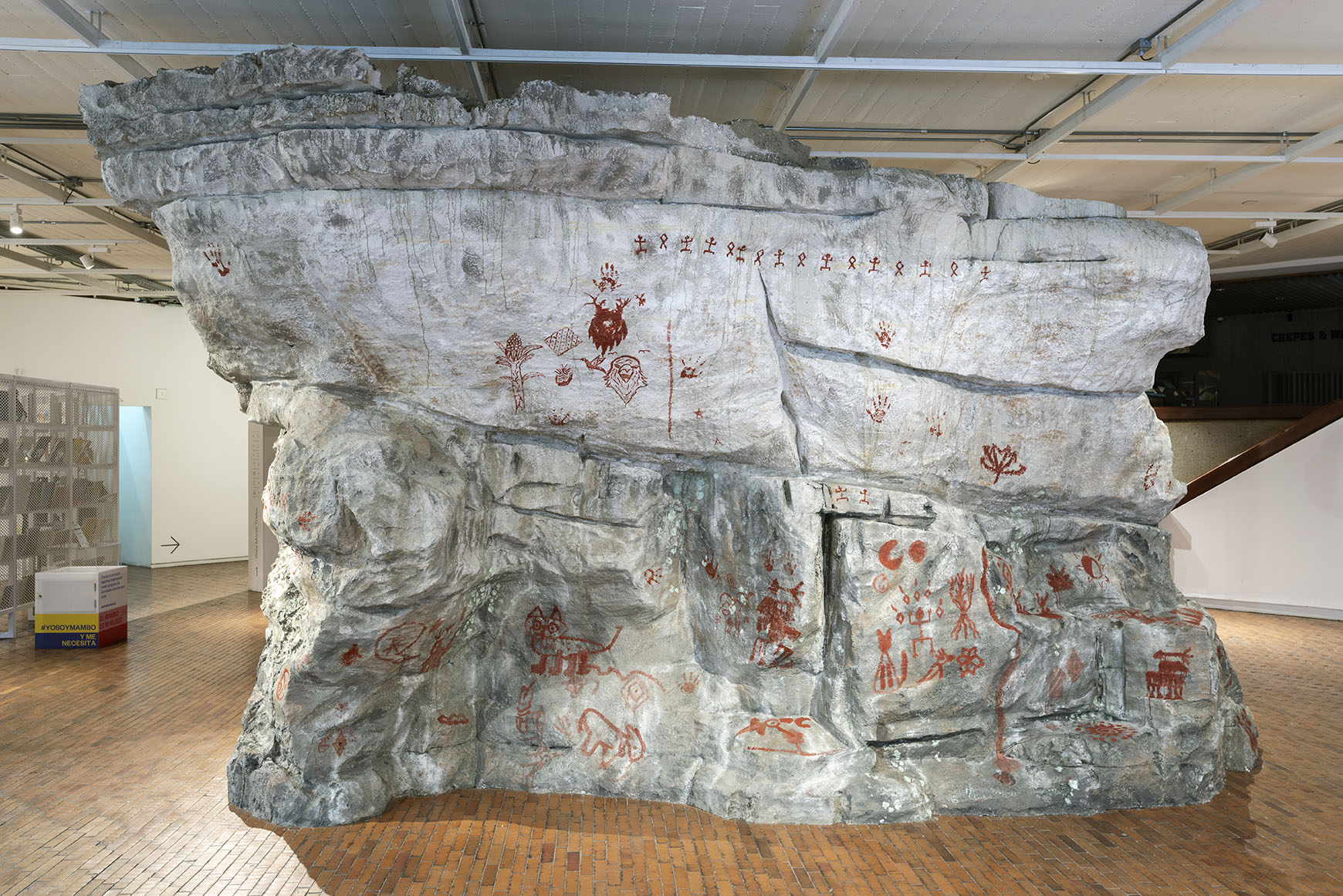 Aquí estamos, 2021, la tercera obra comisionada para la exposición, es una piedra monumental que se asemeja a una formación rocosa localizada en la región de la Amazonía colombiana, en donde recientemente se descubrieron frescos rupestres del período neolítico. La pieza fue concebida para ser intervenida con huellas de manos en una acción colaborativa con niños y niñas que hacen parte de la comunidad indígena Muisca asentada en Sesquilé.